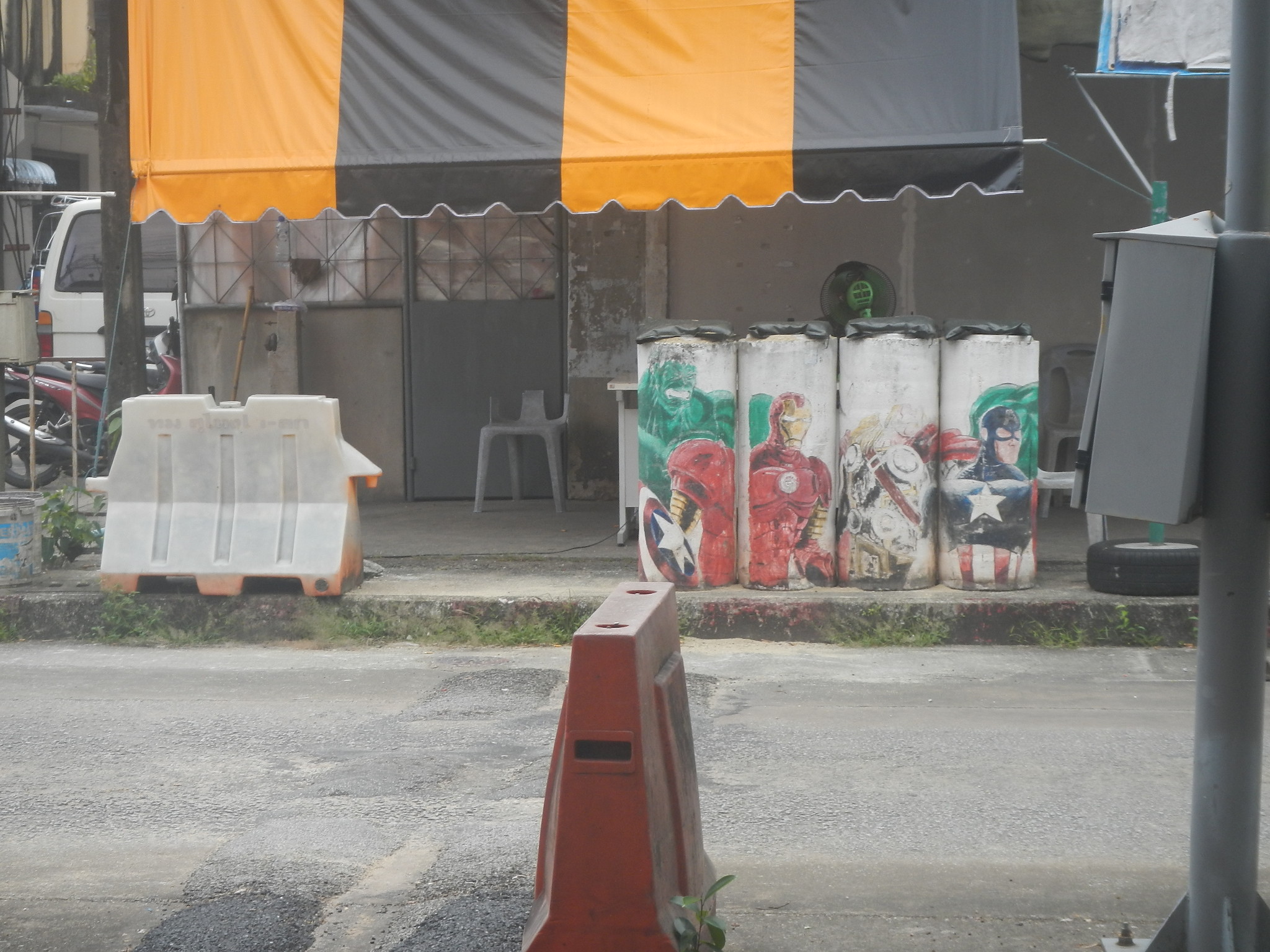 川を一本隔てただけで、物騒だ。テロ対策の検問場にて。爆発除けにはマーベルアベンジャーズが。「強さは正義」と同時に、日本の治安の良さを実感。